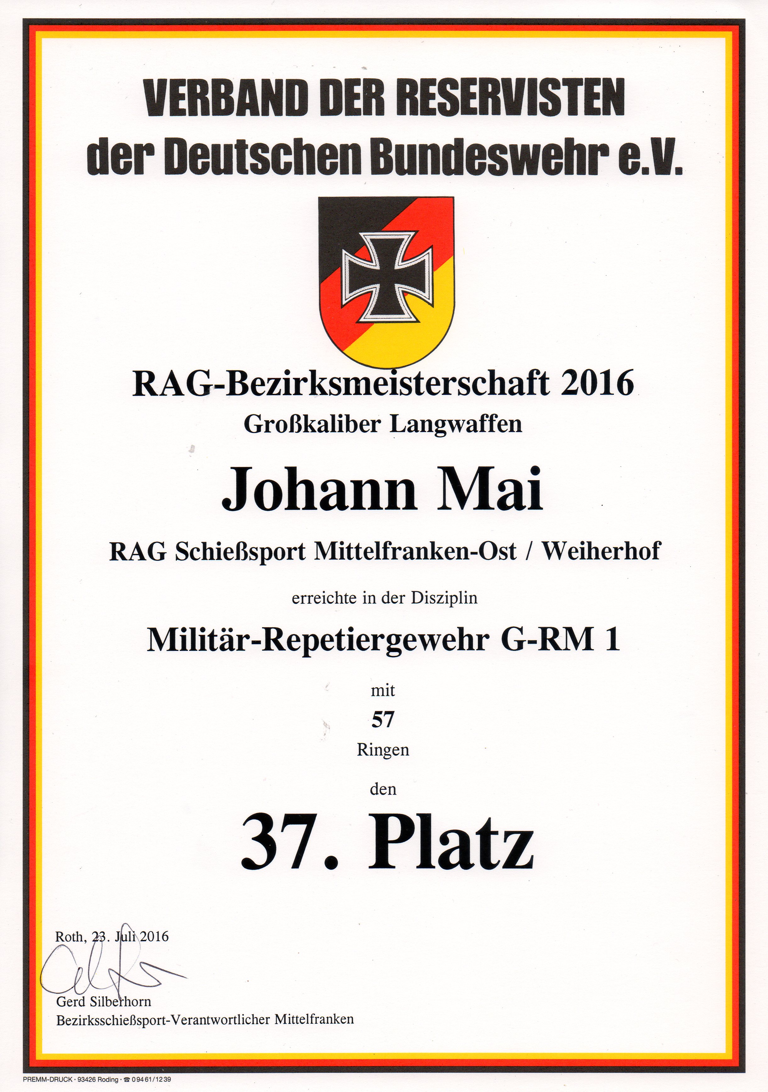 Kurz nach heftigem Gewitter- und Starkregen sowie bei feucht-heißem schwülen Wetter wurde am Samstag, 23.07.2016 in der Sammelstandortschießanlage Roth die diesjährige Bezirksmeisterschaft der RAG'en Schießsport in der Bezirksgruppe Mittelfranken mit Großkaliber-Langwaffen ausgetragen. Insgesamt 56 Schützen aus 14 RAG'en maßen dabei ihre Leistungen in den Disziplinen G-HS 3 (Halbautomatisches Sportgewehr - Dreistellung), G-RM 1 (Militär-Repetiergewehr - Präzision), G-RS 1 (Sport-Repetiergewehr - Präzision) und G-.30M1 (Halbautomatisches Gewehr M1 Carbine - Dreistellung).