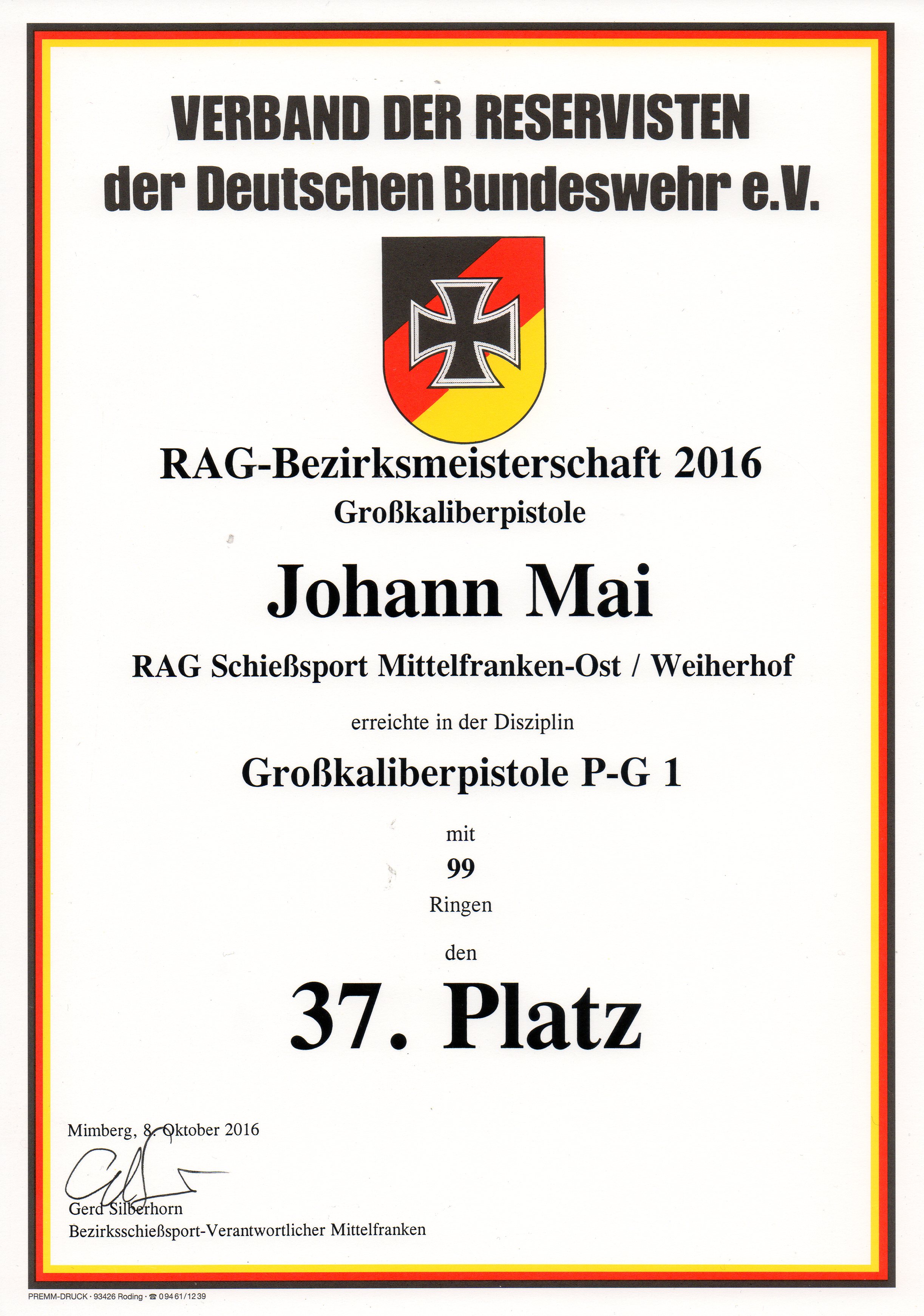 Am Samstag, 08.10.2016 fand in Mimberg die diesjährige Bezirksmeisterschaft der RAG'en Schießsport in der Bezirksgruppe Mittelfranken mit Großkaliberpistolen (P-G 1) statt. Es waren 10 Mannschaften mit insgesamt 39 Schützen aus ganz Mittelfranken zum Wettkampf angetreten.
